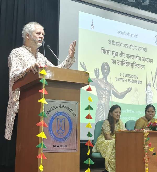 Birsa Munda and Decolonizing Janjatiya StudiesAnlässlich des 150. Geburtstags des Freiheitshelden und Adivasi-Anführers Birsa Munda fand vom 7. bis 8. August 2025 an der Jawaharlal Nehru University (JNU) in New Delhi eine Internationale Konferenz zum Thema "Birsa Munda and Decolonizing Janjatiya Studies" statt, die vom Centre for Indian Languages (CIL) der JNU organisiert wurde. Unser Beiratsmitglied Prof. Heinz Werner Wessler (siehe Foto), nahm mit einem Vortrag auf Hindi an dieser bedeutenden Veranstaltung teil und hielt auch während der Eröffnungs- und der Abschlusssitzung jeweils eine Rede.Seinen ausführlichen Tagungsbericht, der auch in der Zeitschrift Südasien erscheint, können Sie bereits hier lesen. |